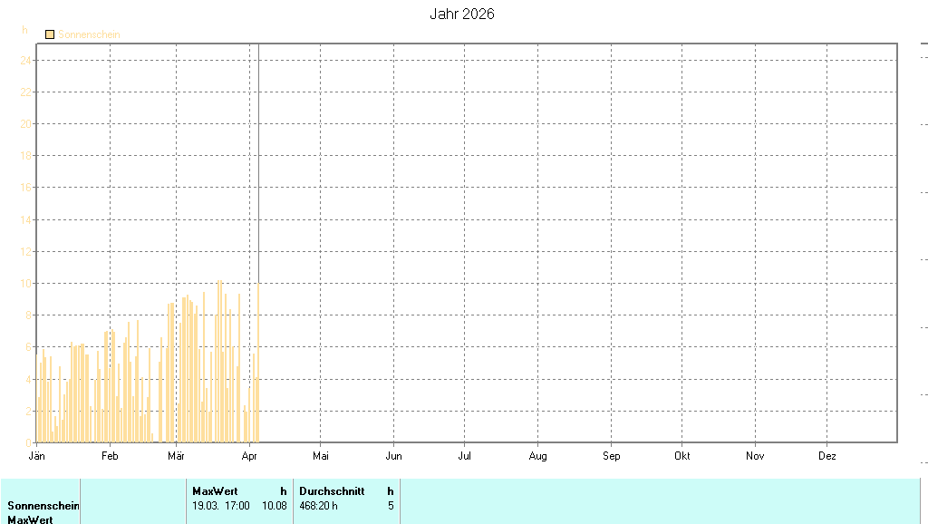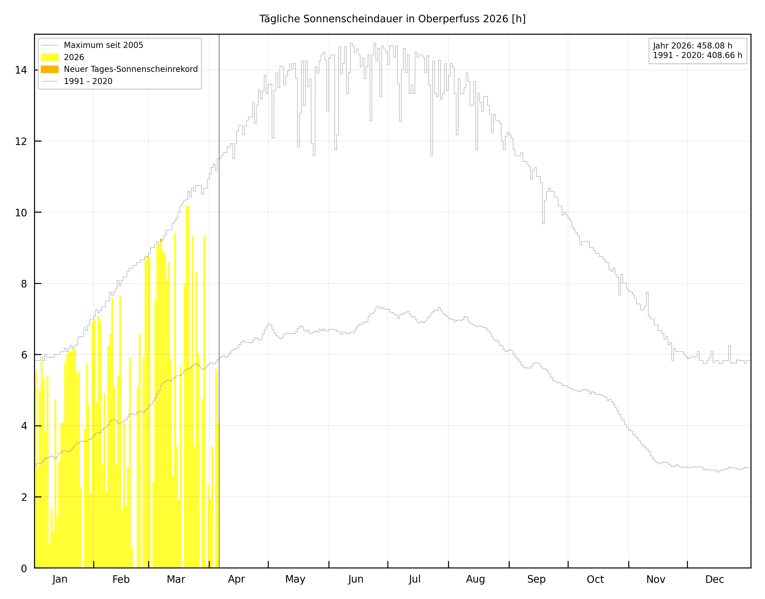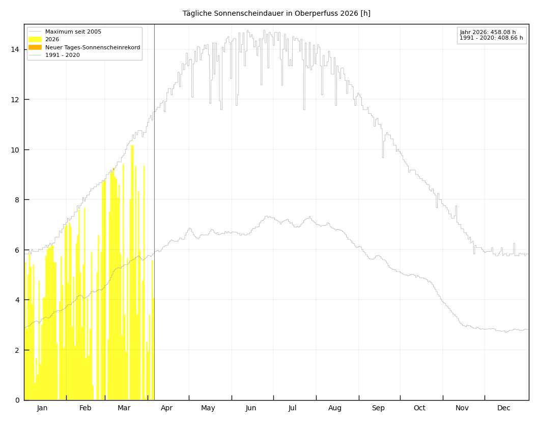Die Tagessummen der Sonnenscheindauer in Stunden (h) sind als gelbe Balken abgebildet. Der Verlauf des langjährigen Mittelwertes ist als eine die Balken schneidende Linie eingetragen. Die maximal (effektiv) mögliche Sonnenscheindauer (aus den bisher gemessenen Maxima), die u. a. die Horizontüberhöhung berücksichtigt, stellt eine die Balken einschließende Linie dar. Wird an einem Tag ein neuer Sonnenscheindauerrekord aufgestellt, ist dieser als oranger Balken dargestellt. |