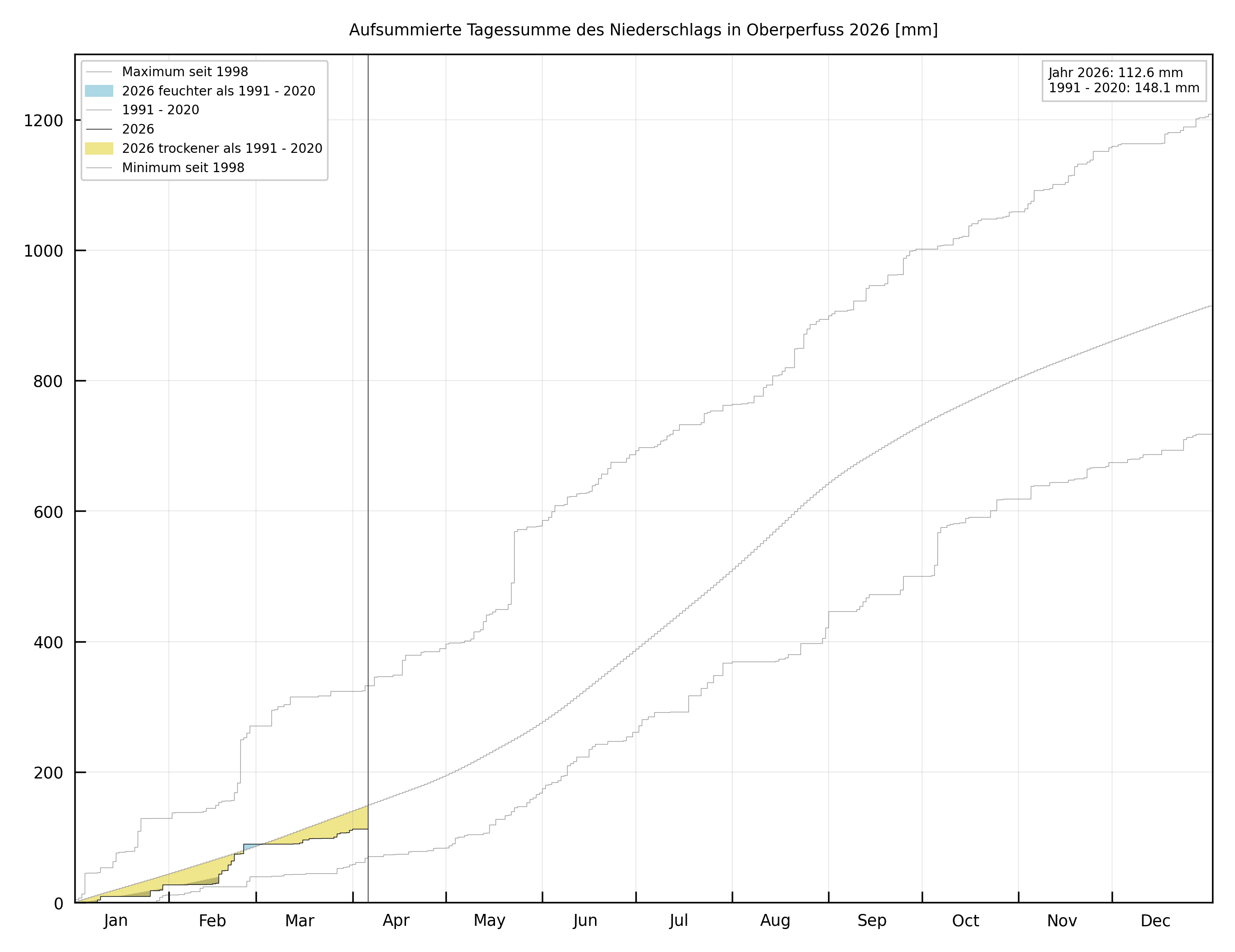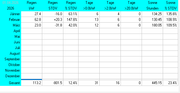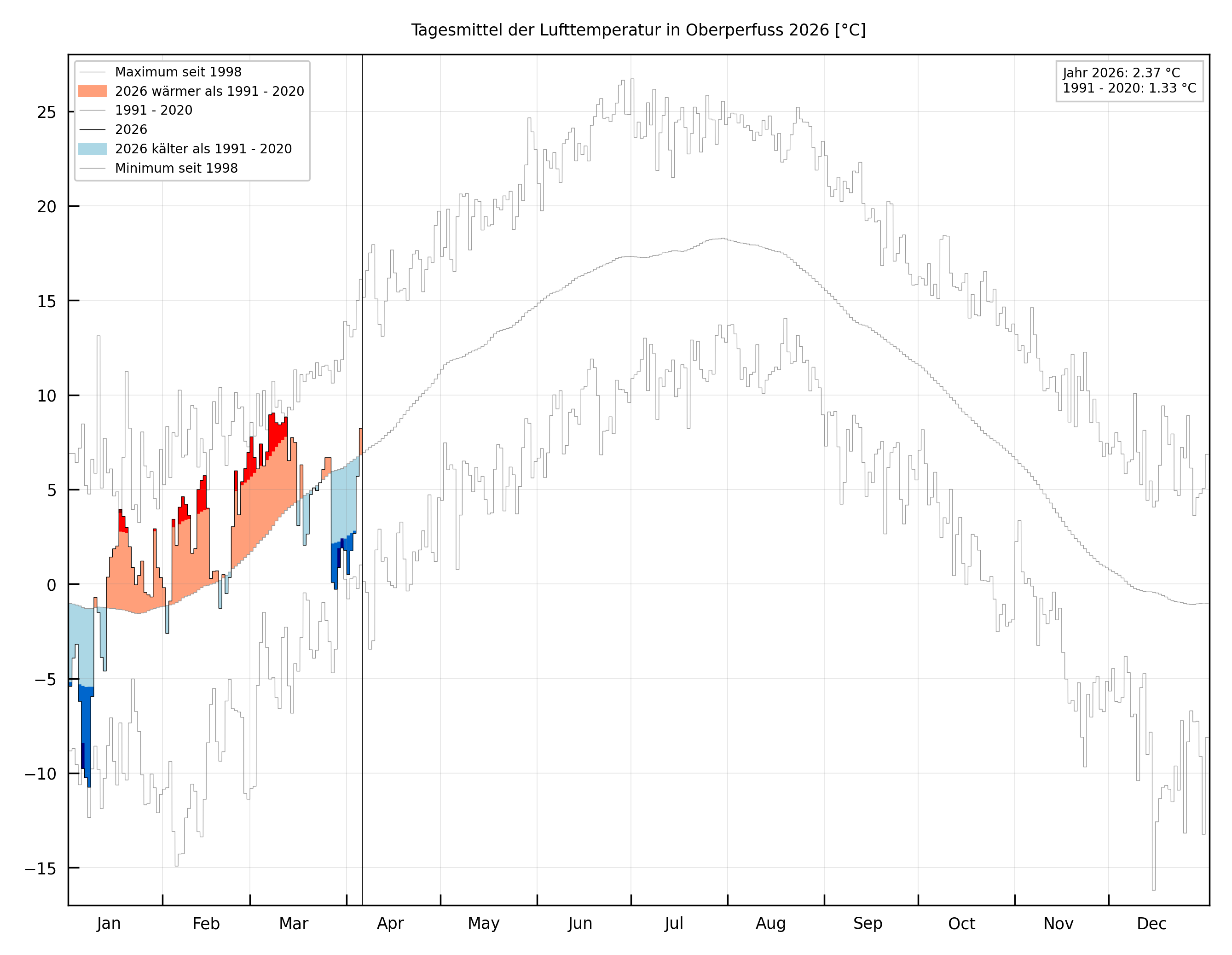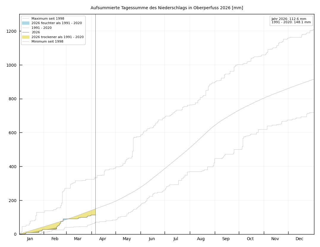 Hier finden sie den 30-tägig fortlaufenden Klimaspiegel (Temperatur, Niederschlag und Sonnenschein) für die Station Oberperfuss Hinterhof. Der Klimaspiegel wird täglich aktualisiert. Unter Klima/Jahresübersicht/Jahr/Klimaspiegel finden Sie den ganzjährigen Klimaspiegel des jeweiligen Jahres. Lufttemperatur